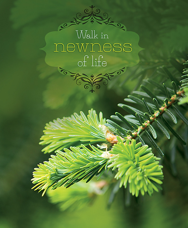 Text: Walk in newness of life. Scripture Reference: Romans 6:4 (KJV). Size: 8.5" x 14" folds to 7" x 8.5"