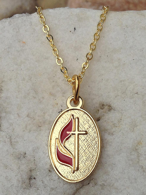 Show your faith-filled allegiance with the United Methodist Cross & Flame Oval necklace - ideal for church pastors and leaders who want to share their affiliation. The United Methodist Cross & Flame emblem is delicately engraved in the classic oval shape and allows one to tell a story through their attire. This affordable necklace’s dimensions are 0.625 inches and comes with an 18” chain, so whether for a special event or everyday garb, this gold-plated necklace will always demonstrate your faith with ease and style! Makes a great gift!