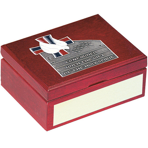 Celebrate a milestone in the spiritual life of a loved one with our Confirmed with The Gift of The Holly Spirit Keepsake Box. This beautiful, finely crafted box offers an elegant and meaningful way to honor their confirmation day. Made of cherry wood with a plush velvet lining, this 4” x 6” keepsake box features an attractive hinged lid and magnetic closure. Inspiring words are printed on the top – ‘Confirmed with The Gift of The Holly Spirit.' An engraving plate is included for personalizing this treasured keepsake for your special someone, and it includes a gift box. Pastors and church leaders can be confident that the recipient will be touched by such a heartfelt gift to celebrate such an important occasion that it will remain cherished for years to come, order today!