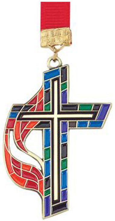 Beautifully stained glass design UMC book mark with a 12" red grosgrain ribbon. It makes a great present avid bible readers and students!