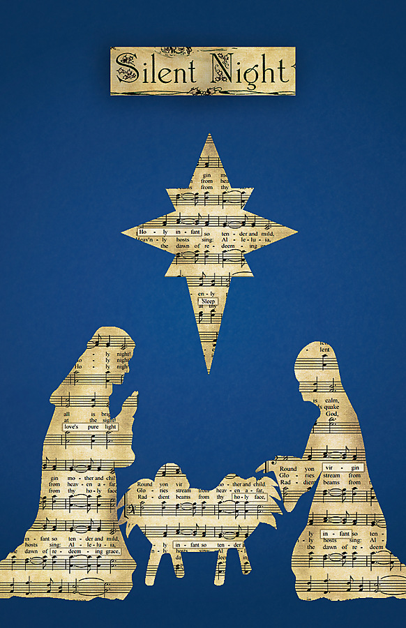 Silent Night Holy Family Silhouettes regular size bulletin is shown folded (8.5" x 5.5"), exactly as church members and guests will receive it. Worship bulletins arrive packaged flat 8.5" x 11" to fit into your printer or copier; shrink wrapped in packages of 100.