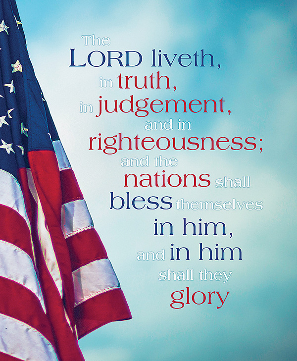 An elegant bulletin featuring the American flag in regular size 8.5" x 14" that can be used as a Patriotic bulletin. Sold in packs of 100. Text: “The Lord liveth, in truth, in judgement, and in righteousness; and the nations shall bless themselves in him, and in him shall they glory”. (Jeremiah 4:2) KJV Also available in Regular Size - 815256026397