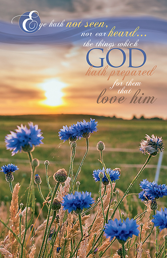 A peaceful regular size bulletin featuring the sunset pillowing over a field of beautiful blue flowers. This bulletin can be used during Funeral occasions. Text: Eye hath not seen, nor ear heard… the things which GOD hath prepared for them that love him. Scripture: “But as it is written, Eye hath not seen, nor ear heard, neither have entered into the heart of man, the things which God hath prepared for them that love him.” 1 Corinthians 2:9 (KJV).