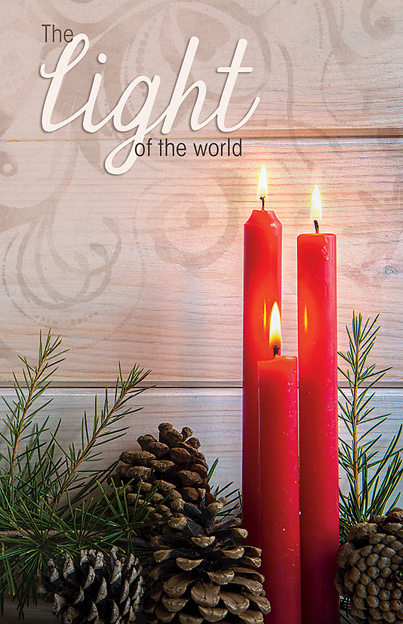 A vibrant Christmas bulletin with red candles with a wood background. Size: 8.5" x 11" folds to 5.5" x 8.5" Text: "The light of the world." John 8: 12 KJV