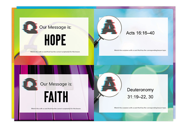 A craft activity with cards you can cut out. These have the A “A NEW SONG The Message in Our Music!” lesson topics printed on them, along with the corresponding lesson Scriptures. Teachers can use this activity to test their students' knowledge of the lessons.