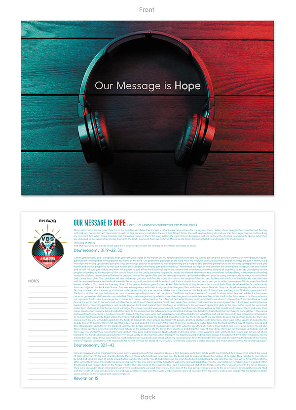 Each of the five 2-sided note cards relate to one of the 5-Day lessons under the "A New Song! The Message in Our Music" theme. Side one corresponds with the 5-Day lesson inspirational poster images, while side two has the full scripture(s) for that day's lesson along with space to write notes and reflections.