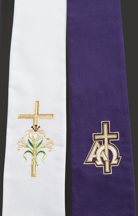 The purple side of the Stole features an Alpha and Omega; the White side of the