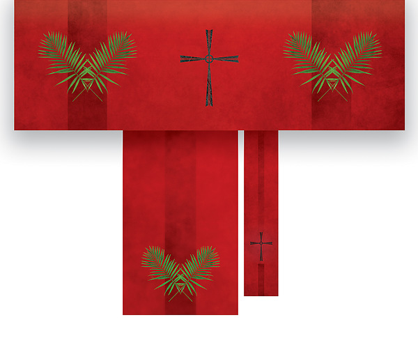 Praise to the King!  Bring joyful celebration to your Palm Sunday service with the Passion Cross Economy Parament Set! These affordable unlined paraments are high-quality and printed on satin fabric using high resolution heat-sealed inks for crisp vibrant colors and have double-stitched hems with heat-trimmed edges for straightness and durability!  (The full Altar Set includes the Altar Frontal, Pulpit Scarf and the Bible Marker, see below) Table Runner, Stole and Banners also available!  Order early to ensure timely delivery!  Made in USA.  (Available in purple or red – see below)