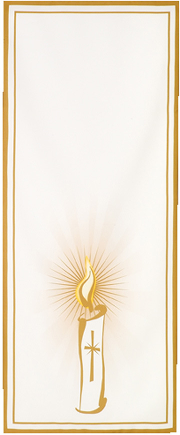 This white Christmas Candle Overlay is designed to be added to your altar during Christmas week. The Overlay is 18" wide x 55" deep allowing for a 25" overhang displaying candle graphics in a tiered fashion that fits perfectly in the center of the Altar Frontal (item 820830032800).