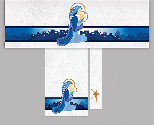 Celebrate the wonder and awe of Advent in your church with the Mother and Child 3-Piece Christmas Parament Set! Highlighting a stunning image of Mary holding baby Jesus in rich blue shades, all set on a beautiful, white-patterned background, this set is also easy on your budget! Crafted from 100% polyester poplin with a matte finish, this unlined parament set offers a beautiful and affordable option for your altar this Christmas. This high-quality set comes with three pieces that enhance the celebration of Jesus' birth, an Altar Frontal, a Pulpit Scarf and a Bible Marker. Give your congregation a powerful visual reminder of the season with the Mother and Child 3-Piece Christmas Parament Set! Order early to ensure timely delivery! Made in USA.