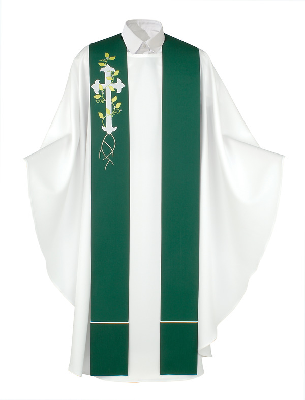 Looking for a beautiful addition to your vestments? This handsome stole features outstanding craftsmanship and elegant simplicity! Set on a rich green background and featuring an appliquéd white satin Trinity Cross on upper right panel, it finishes with lacy and delicate embroidery of lime green vine and leaves with tiny white flowers. Made of woven suraline polyester with a smooth finish and lined for body and stability, this stole will be cherished for years to come. Makes a great gift for someone special! Made in USA.
