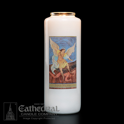 6-day glass bottle style prayer candle which features an original full color image of St. Michael the Archangel produced on a highly durable film. Sold in boxes of 12. Made in the USA.