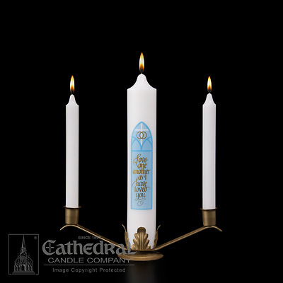 This distinctive ensemble executed in soft tones projects the deep significance of the matrimony ceremony. The ensemble includes center candle (2” x 12”) and two side candles and finished gold stand as pictured. The center candle has lovely outline of window with two entwined gold bands in the top portion of the pane and the words “Love one another as I have loved you” written in the main portion of the pane.