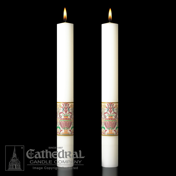 Investiture Paschal candle. Exquisitely crafted of 51% pure white beeswax, it also features the same tapestry pattern found on the matching paschal candle. 51% beeswax, 1.5" x 12" size. Sold in pairs.