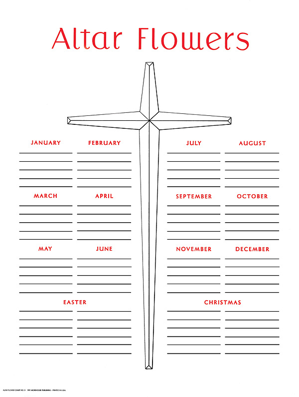 Printed in red and black on heavy vellum. Provides five lines for each month of the year plus six lines for both Easter and Christmas. 17" x 22". Perfect way to organize the alter flowers every Sunday of the year.