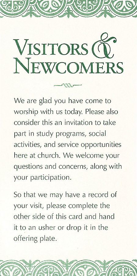 This two-sided, revised version of the pew or tract-rack card welcomes visitors and newcomers into the church. The updated card invited individuals to record their name, address, and other pertinent information for use by the church office or clergy. 3" x 6"