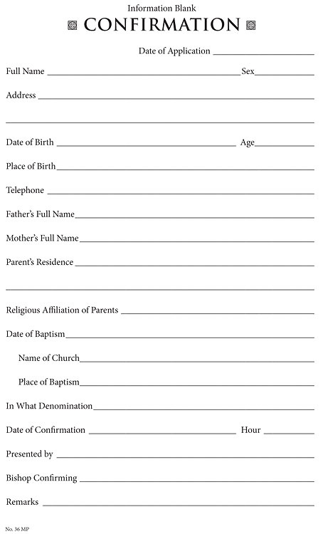 Downloadable form to print for use before a confimation to help collect the information necessary for parish records and planning the service.