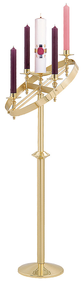 This beautiful Floor Model--Adjustable Ring Advent Wreath is versatile and instantly adds a contemporary flair to your Advent service. Ring adjusts from level position to a 45º angle. Height varies from 48” level to 55” in tilted position. Candles remain upright in every position. Furnished with 1 1/2" sockets that accommodate regular candles. Ring is 21”, two-tone, satin, and bright finish. 12” weighted base. Polished to a high luster and protected by an exclusive urethane finish for years of worry-free use. Uses 1 1/2" Advent candles. 8” x 23”, 12lbs. (Greenery and Advent candles not included.)