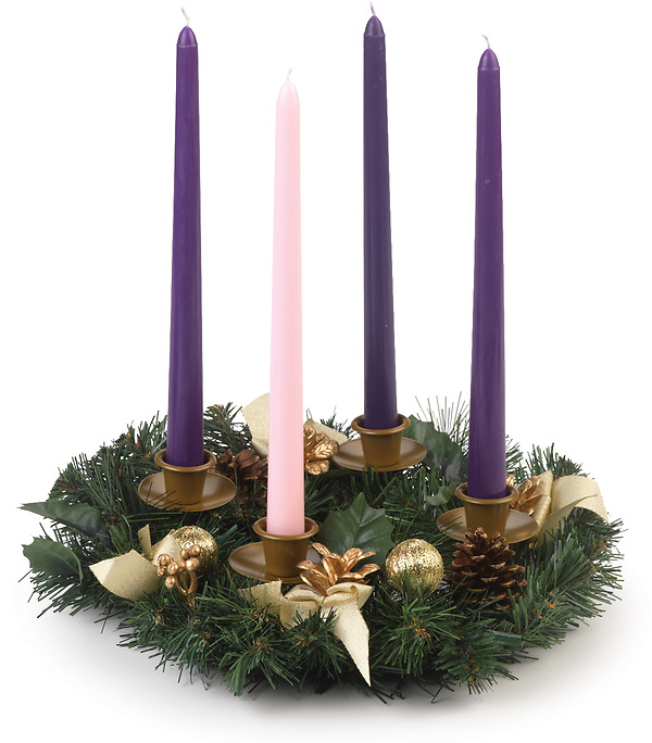 The Advent wreath is the traditional centerpiece of the Christmas season. A candle is lit on each of the four Sundays preceding Christmas. Three candles are purple and one is rose or pink. The first candle represents hope. The second candle peace. The pink candle, generally lit on the third Sunday of Advent, represents joy. The final candle signifies love.