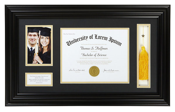 This framed piece is a wonderful way to honor any graduate for his/her achievement. It remains a keepsake for anyone. Each piece contains a place for a tassel, a 4"W x 6" H photo and a diploma to all be easily inserted. Also has Scripture Jeremiah 29:11 framed.Hanger back