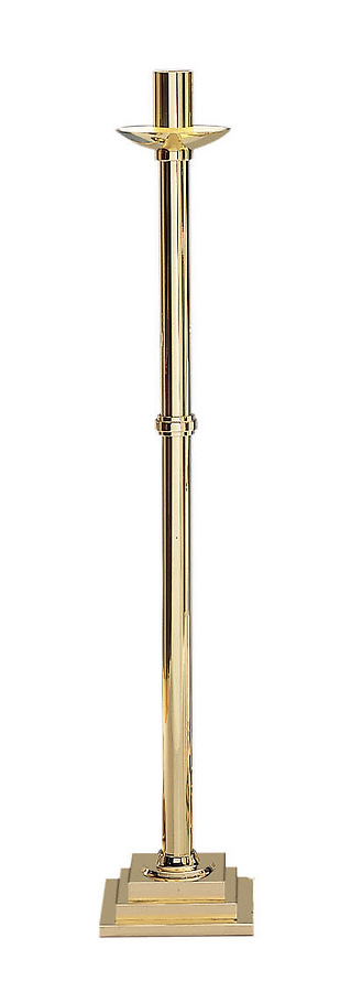 This classic polished brass paschal candlestick from Sudbury is 44" high with an 8" square base and a 2" diameter candle socket. Imported. Candle not included.