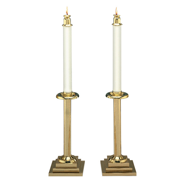 Beautiful in their simplicity, these highly polished solid brass candlesticks feature Calvary square bases with their precise corners. Candles not included.
