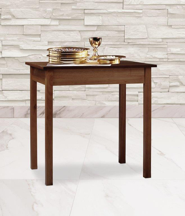 This is the perfect communion table for smaller churches or chapels. It can hold everything you need for your church service without taking up a large footprint. Made of maple hardwood with veneer and stained in a walnut finish. Features a matte sheen finish that helps resist fingerprints. Clean with furniture polish and a cotton cloth. Ships flat with some minor assembly required. Dimensions are 32"W X 32" H X 24"D.