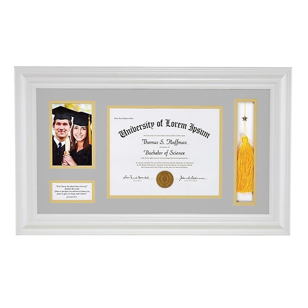 This framed piece is a wonderful way to honor any graduate for his/her achievement. It remains a keepsake for anyone. Each piece contains a place for a tassel, a 4"W x 6" H photo and a diploma  to all be easily inserted. Also has Scripture Jeremiah 29:11 framed.Hanger back
