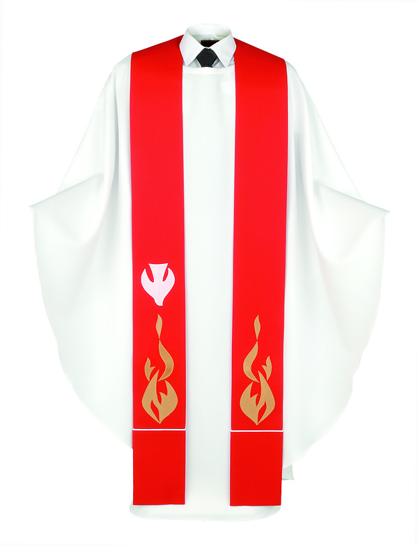 Our beautiful Red Flame Dove Stole features outstanding craftsmanship and elegant simplicity; with appliquéd flame on both panels and a dove on one panel, set on a red background with a smooth finish, this woven suraline polyester stole is interlined for body and stability! Size: 110" long and 5" wide. This stole also makes a wonderful gift for someone special – order today!