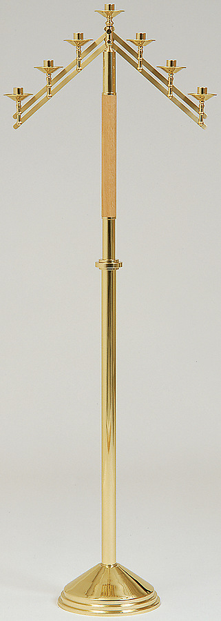 This highly polished floor candelabra is made of oak and brass. Convenient adjustable arms are easily accessible. 60" high. 7/8" sockets come with 10.5" base.