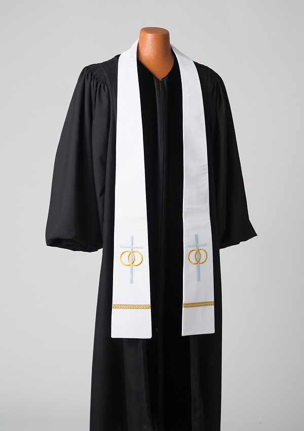 Help celebrate this special occasion with our white tapered Wedding Stole featuring embroidered entertwining wedding rings and cross; 100% polyester Liberty fabric with gold braid at bottom. 92" long; 5 1/2" wide.