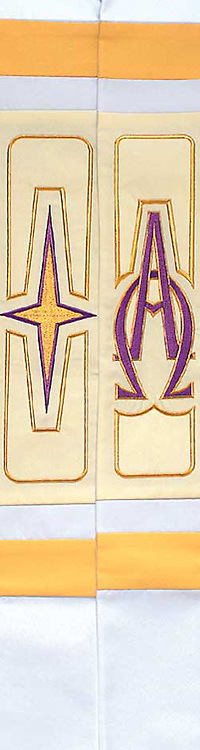 This beautiful stole in white with design of Star Cross and Alpha/Omega features vibrant colors and intricate detailing with a unique combination of embroidery and appliqués. It is perfect for either the Christmas or Easter season. Liberty fabric is treated for soil resistance and color-fastness for years of service. This stole is 110".