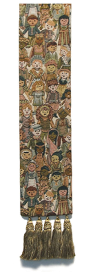 This unique Children of the World woven tapestry stole speaks of world mission, enclusivity, and peace. Stole features small pattern of children from all the world and a contoured-shaped neck with tasselts on the bottom edges: 110" long.