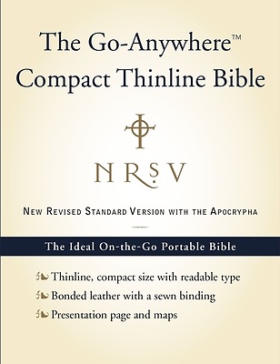 The NRSV Go-Anywhere(TM) Compact Thinline Bible is less than an inch thick, offering a compact size that combines the portability expected in a compact bible with the readability of a larger Bible. This NRSV Bible places the apocryphal and deuterocanonical books between the Old and New Testaments.