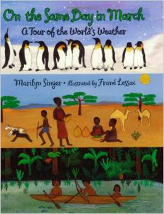 In this poetic exploration of longitude and weather, with bright and detailed paintings of seventeen different places, Marilyn Singer and Frané Lessac show us what's happening from the poles to the equator--all on the same day in March.