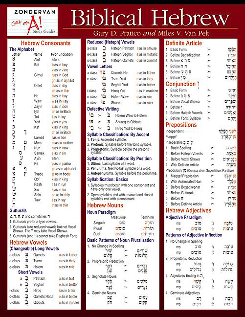 Now there's a a better way! The Zondervan Get an A! Study Guides to Biblical Greek and Biblical Hebrew are handy, at-a-glance study aids ideal for last-minute review, a quick overview of grammar, or as an aid in translation or sermon preparation. Each set contains four information-packed sheets that are laminated and three-hole-punched, making them both durable and portable.