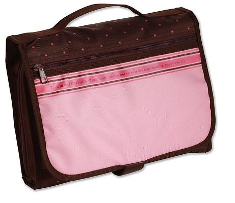 Stay organized with this tri-fold Bible cover, featuring pink polka dots on one side and the verse "Trust in the LORD with all your heart and lean not on your own understanding" from Proverbs 3:5 on the other side. The interior and exterior pockets and handy carrying handle make this stylish pink and brown Bible organizer a great way to travel with your Bible, while protecting your notes and other materials as well.