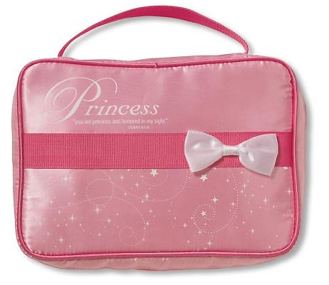 Help your little princess stay organized with this pink Bible cover fit for royalty. This cover features a soft satin-like material with a silk-screened twinkling star design and a ribbon band with a white bow. It also features the word "Princess" in beautiful scripted lettering along with the quote, "you are precious and honored in my sight." - Isaiah 43:4.