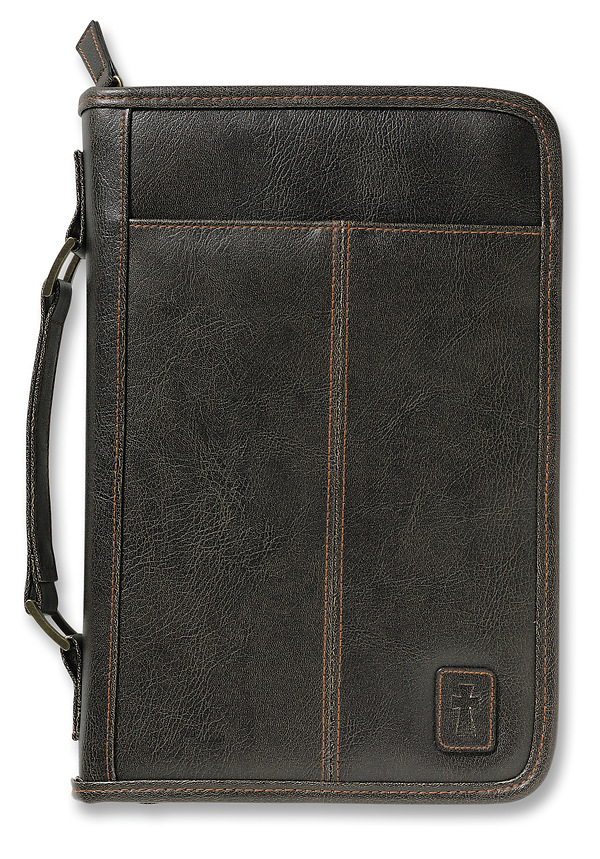 This sturdy Bible cover features a classic design in a popular weathered look. Contrasting tan stitching on a durable brown imitation leather material gives this book and Bible case a handsome style, with a subtle cross design patch in the corner. The interior and exterior pockets and handy carrying handle make this a great way to travel with your Bible, while protecting your notes and other materials as well.
