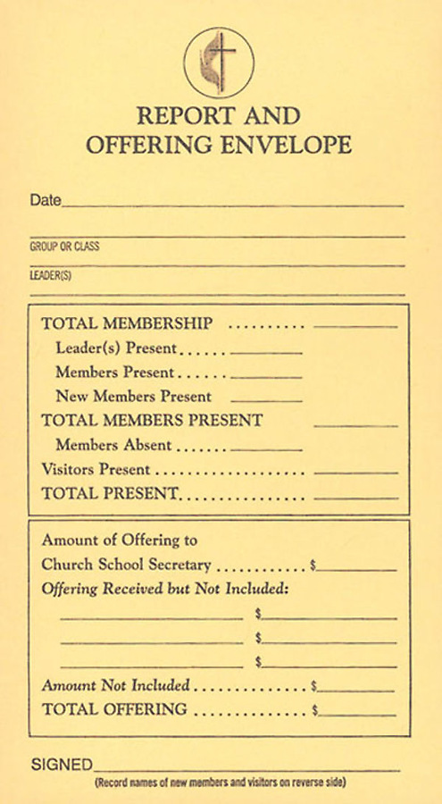An important tool to review information concerning members of your church school classes and small groups, this Report and Offering Envelope provides space for date, class, leader’s name (or leaders’ names), offering, total membership, members present and absent. The envelope is 3” x 5”, and is available in boxes of 500.