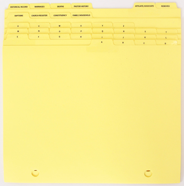 This is a component of the UMC Membership Record System Binder. It is the index tabs that separate the various record sheets (baptism, permanent church register, family/household roll, etc.).