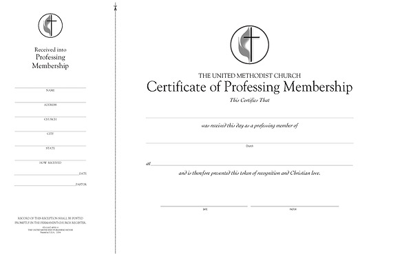 As the pastor, church staff, and congregation nurture individuals through their faith journeys, they celebrate each milestone. Certificates of Professing Membership create a permanent record of these important events and provide a meaningful remembrance and keepsake. The certificate featuring the image of the cross and flame in a circle; each certificate with a perforated record stub to record this profession of membership in the permanent church register. Size of certificate is 8 1/2" x 11”. Available in shrink-wrapped packages of 26.