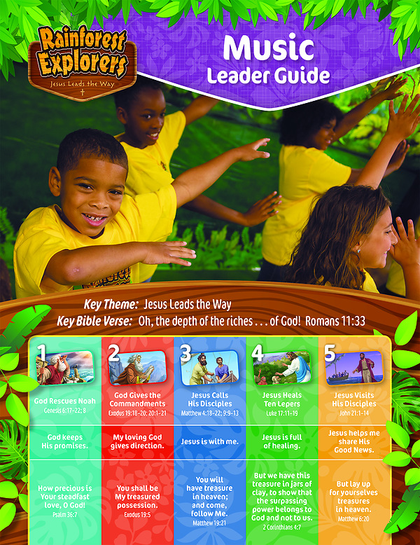 High-energy VBS songs share the message of God’s guidance for us through Jesus, our Savior. Simple, repeatable, and active lyrics help kids grow in faith and remember God’s Word. Use the music during Opening and Closing, make a separate music rotation site, or interweave music throughout all of your stations. Our Music Leader Guide (with 2-Disc Set) provides all of the 2020 VBS music plus guitar chords, lyrics and scores, song-action videos, and hymn suggestions. Included in the Starter Kit. 2020 Rainforest Explorers VBS Songs 1. Jesus Is My Treasure 2. Jesus’ Love 3. God Showed Us the Way 4. Come and Follow 5. Jesus, Jesus 6. Go, Go, Go 7. Beautiful Savior 8. Take My Life and Let It Be 9. Psalm 36:7 10. Exodus 19:5 11. Matthew 19:21 12. 2 Corinthians 4:7 13. Matthew 6:20 14. Jesus Loves Me 15. Jesus, You Are Always Near 16. Child of God 17. Let’s Go, Go, Go 18. Hallelujah! Praise Ye the Lord!