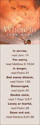Broadman Church Supplies Bookmarks feature beautiful 4-color images and copy designed for different uses. This 2" x 6 1/2" bookmark is designed for use as a teaching marker. They are sold in shrink-wrapped packages of 25 identical pieces. This marker suggests Scriptures to look up for encouragement.