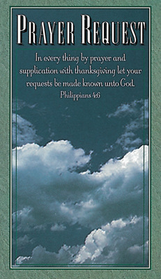 Prayer Request Pew Cards measure 2 7/8" x 5" and are printed in 4-color on quality card stock to gather information such as who to pray for, praises, and contact information for the submitter. Philippians 4:6 (KJV) Scripture on the front. Shrink-wrapped in package of 50 cards.