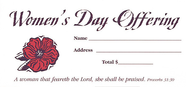 The special Women's Day Offering envelopes are large enough to hold currency or a check without folding. Each envelope has space for name, address, amount given along with appropriate art and scripture emphasizing the envelope's particular use.