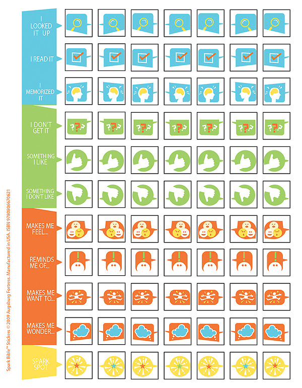 These easy-to-use sticker packs help children, youth, and adults mark important, challenging or confusing parts of Scripture. With categories like, "I memorized it" and "Reminds me of...", these stickers help kids make their Spark NRSV Bibles their own. Designed for use with the Spark NRSV Bibles, but helpful for studying any Bible! Each pack contains five identical sheets of stickers.