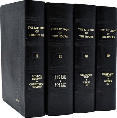 The complete set of the official English edition of the Liturgy of the Hours (Divine Office) from Catholic Book Publishing contains all four volumes of the translation approved by the International Committee on English in the Liturgy. Includes the current St. Joseph Guide for the Liturgy of the Hours (Product Code: 400/G), the Liturgy of the Hours Supplement (Product Code 405/04), and Inserts for the Liturgy of the Hours (Product Code 400/I). Additional copies of the current St. Joseph Guide for the Liturgy of the Hours (Product Code: 400/G) are available for $2.50 each. Printed in two colors and bound in bonded leather, this complete four-volume set of the Liturgy of the Hours includes handy ribbon markers and features a gold-stamped spine and elegant gilded page edging. Sold only as a set.