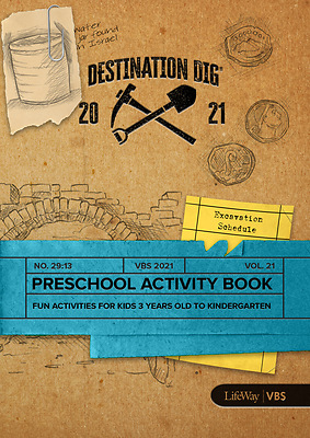 The VBS 2021 Preschool Activity Book is designed for kids from ages three through completed kindergarten, this Activity Book is used during Bible story group time and is a great take-home resource. This 16-page booklet includes Bible stories, activities, games, and a parent letter to help continue Bible learning at homeVBS 2021 Preschool Activity Book ·This activity book engages preschoolers during Bible study and challenges them to continue studying the Bible after VBS ·Also available in a digital format ·Order one for each preschooler ·Additional resources: ·VBS 2021 3s–Pre-K Bible Study Leader Guide ·VBS 2021 Kindergarten Bible Study Leader Guide ·VBS 2021 Preschool Memory MakerLifeWay’s 2021 VBS: Destination Dig: Unearthing the Truth About Jesus takes kids to present-day Israel to become junior archaeologists and study tangible pieces of the past to learn about who Jesus is and why He came. Along the way, they will uncover the truth of Jeremiah 29:13 that God reveals Himself to us when we seek and search for Him with all our hearts.