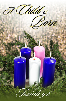This Broadman bulletin is for the Christmas service of the Advent season. The beautiful 8 1/2" x 11" sized bulletin features the 5 candles used to celebrate the Advent season featuring the portion of the verse stating," For Unto Us A Child Is Born", and scripture from Isaiah 9:6 in the KJV translation. All Broadman bulletins are sold in shrink wrapped packages of 100 bulletins.